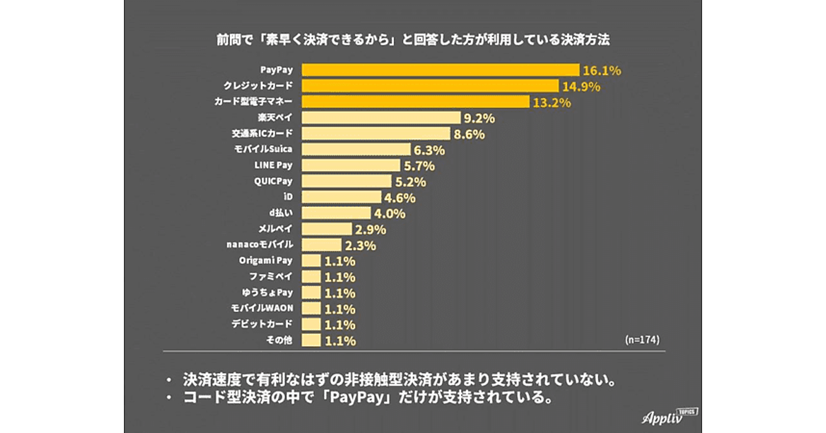 具体的な手段を聞くと「前から使っているから」ではクレジットカードが、「還元率が高いから」ではPayPayが、「素早く決済ができるから」でもPayPayがトップだった。とくに「素早く決済ができるから」という理由でPayPayが1位になったことに対しApplivでは、「アプリを起動する必要がなく決済速度で有利と思われる『カード型電子マネー』や『交通系ICカード』『非接触型スマホ決済』よりも『PayPay』が支持されたのは意外」だと指摘している。CMなどを通じ“手軽・カンタン・素早い決済方法”といったイメージを構築することにPayPayが成功したことが伺える。