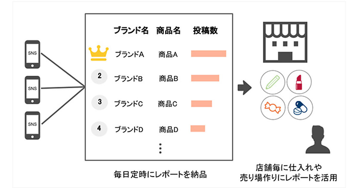 オーディオ家電、コスメ、サプリメントなど特定の商品ジャンルでのSNSの投稿数ランキングや、スキンケアブランド、コスメブランドなどブランドごとのSNSの投稿数をレポートする。中国のデータ解析サービス会社の調査では、訪日中国人の86%は旅行前に買い物リストを作成し、情報収集にSNSが利用されているという。