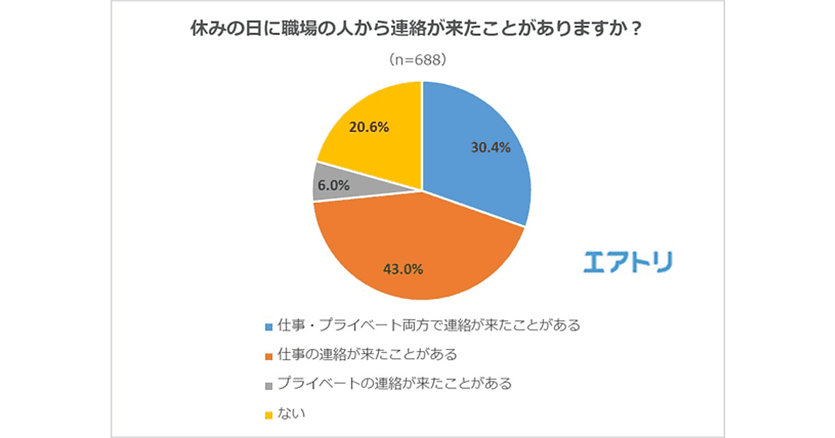 まず「休みの日に職場の人から連絡が来たことがありますか?」と聞くと、「仕事の連絡が来たことがある」43.0%、「仕事・プライベート両方で連絡が来たことがある」30.4%、「プライベートの連絡が来たことがある」6.0%、「ない」20.6%という結果となった。7割以上の人が、休日に仕事の連絡を受けた経験ありということになる。