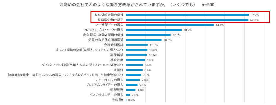 まず「現在勤めている会社で、どのような働き方改革がされたか」を聞くと、「有給休暇取得の推進」62.7%、「長時間労働の是正」62.0%がツートップ。やや数字が離れて「ノー残業デーの導入」44.4%が代表的な施策と言える。