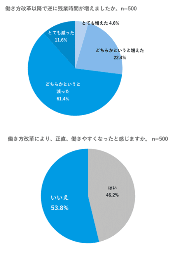続いて「働き方改革以降で、逆に残業時間が増えましたか」「働き方改革により、正直働きやすくなったと感じますか」と、赤裸々な実状をストレートに聞くと、残業時間については「どちらかというと減った」「とても減った」の合計が73.0%に達したが、働きやすさについては「働きやすくなったと感じない」が半数以上の53.8%と上回った。感覚的には、働きやすさを実感できるまでには至っていないようだ。