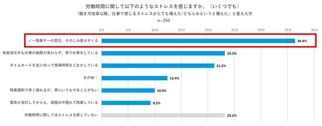 「労働時間に関して感じるストレス」を具体的に聞いてみると、「ストレスを感じていない」23.2%が存在する一方、「ノー残業デーの翌日、そのしわ寄せがくる」36.4%という意見が、それを上回った。「仕事の自宅持ち帰り」や「タイムカード打鍵後の残業」など、旧態依然とした不満も多い。自由意見では、「サービス早朝出社をしている」「監視状態になっている」といった声もあった。