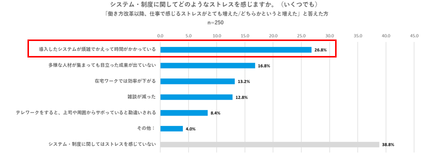一方「システム・制度に関して感じるストレス」では、「ストレスを感じていない」38.8%方が多数派。「導入したシステムが煩雑でかえって時間がかかっている」26.8%がそれに続いた。