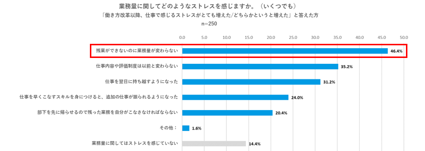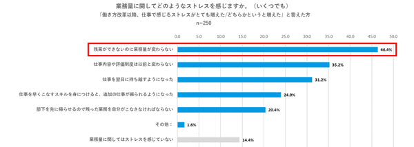 「業務量に関して感じるストレス」では、「残業ができないのに業務量が変わらない」46.4%が断トツで、“残業規制をするだけではかえってストレスの元になりかねない”という現場の切実な実状がうかがえる。