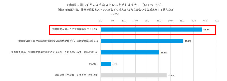 そして「給与に関して感じるストレス」では、「残業時間が減ったので残業手当がつかない」43.6%、「税金が上がったのに残業時間で残業代が稼げず、生活が窮屈に感じる」35.6%が上位となった。