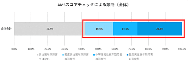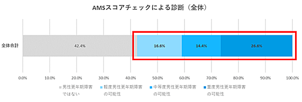 なお、国際的に用いられる男性更年期障害のセルフチェック「AMSスコア」にも同時回答してもらった結果、「軽度・中等度・重度の男性更年期障害の可能性」があるのは57.6%と、半数を超えていた。「中等度・重度の男性更年期障害可能性」41%を当てはめると、日本国民の20代~50代男性は3,130万人(総務省調べ)であるため、約1,200万人超に、男性更年期障害の疑いがあるという。同調査では、「働く男性の“働き方改革副作用”とも言える現代ならではのリスクが見える」と指摘している。