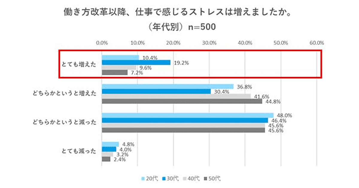 働き方改革以降、仕事で感じるストレスについても、「とても増えた」11.6%、「どちらかというと増えた」38.4%で、半数がむしろストレスを増加させている。年代別では30代の「とても増えた」が目立つ。