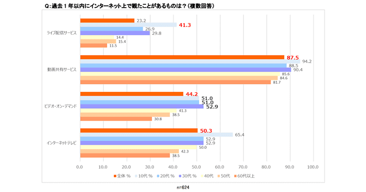 8割超がYouTubeなどの「動画共有サービス」を視聴、10代は「ライブ配信」が突出