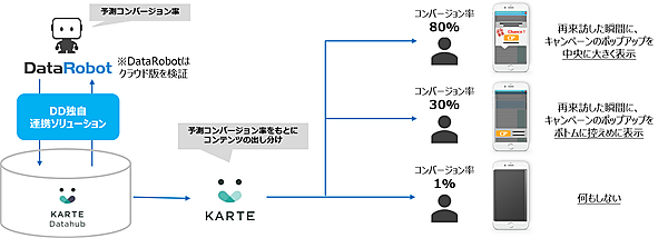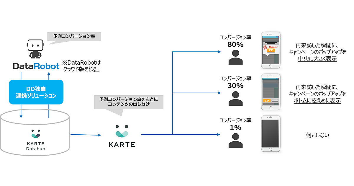 このソリューションは、企業向け機械学習プラットフォーム事業を行うDataRobot Japanの同プラットフォーム「DataRobot」と、CXプラットフォーム開発のプレイドが展開する同プラットフォーム「KARTE(カルテ)」を連携。同社の統合データプラットフォーム「KARTE Datahub」に蓄積された顧客の行動・属性データを使う。