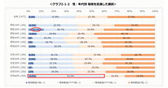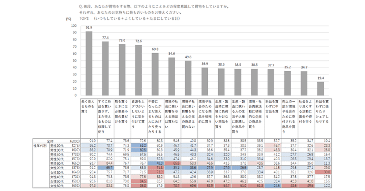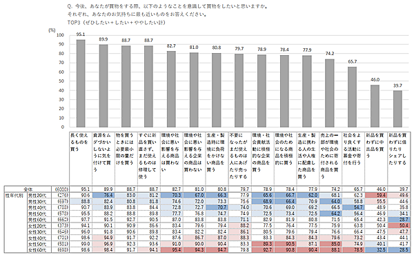 年代別で見ると、20代・30代女性では「不要になったがまだ使えるものは人にあげたり売ったりする」が「資源をムダづかいしないように気を付けて買う」より高い。この層にはネットオークションやフリマサービスなどが浸透しているためと推測される。男性では60代で「環境や社会に悪い影響を与える商品は買わない」という声が強い。