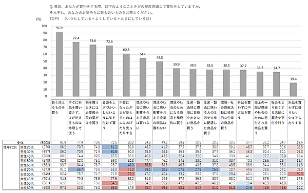 まず、「ふだんの買物時に意識していること」(いつもしている+よくしている+たまにしているの合計)を選択式で聞いたところ、91.9%の人が「長く使えるものを買う」と回答してトップだった。