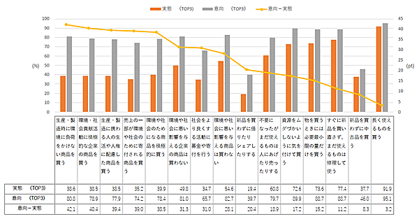 現在の購買実態との差で見ると、「生産・製造時に環境に負荷をかけない商品を買う」は42.1ポイント、「環境・社会貢献活動に積極的な企業の商品を買う」は40.4ポイント上昇しており、今後さらに「環境・社会に配慮している商品・企業かどうか」が、購入時の判断基準になるだろう。