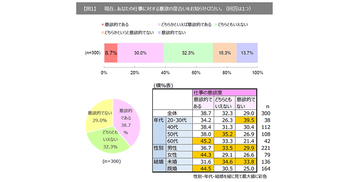 まず「仕事に対する意欲の度合い」を聞くと、「意欲的である」としたのは8.7%にとどまる。「どちらかといえば意欲的である」30.0%を加えても、半数には至らなかった。年代や属性でみると、「60代」「女性」「既婚者」のほうが意欲的な傾向が見られた。