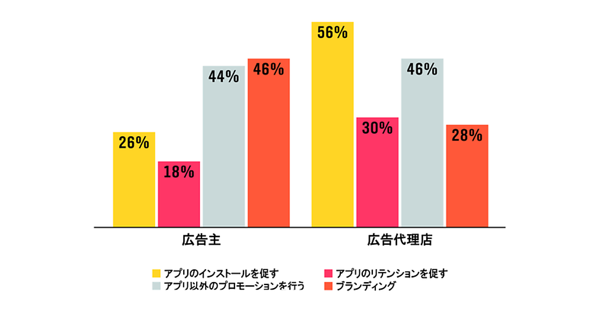「アプリ内広告を実施する目的」を聞くと、広告主は「ブランディング」46%がトップだが、広告代理店は「アプリのインストールを促す」56%がトップだった。