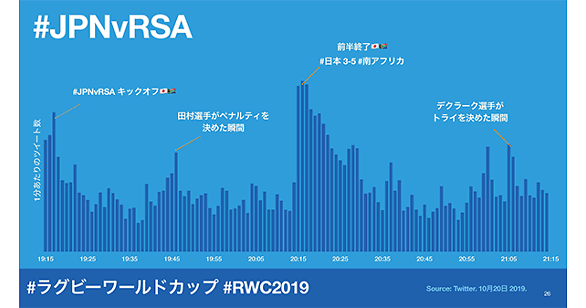 まず、試合が盛り上がった瞬間に素早くコンテンツを投稿すること。日本対南アフリカの試合では、キックオフ、ペナルティを決めた瞬間、トライを決めた瞬間などの他、ハーフタイムでも1分あたりのツイート数が多くなったという。RWC日本語版公式アカウントは、このツイート数が多くなる瞬間の出来事から、わずか1、2分でコンテンツを配信。ユーザーの会話を盛り上げた。