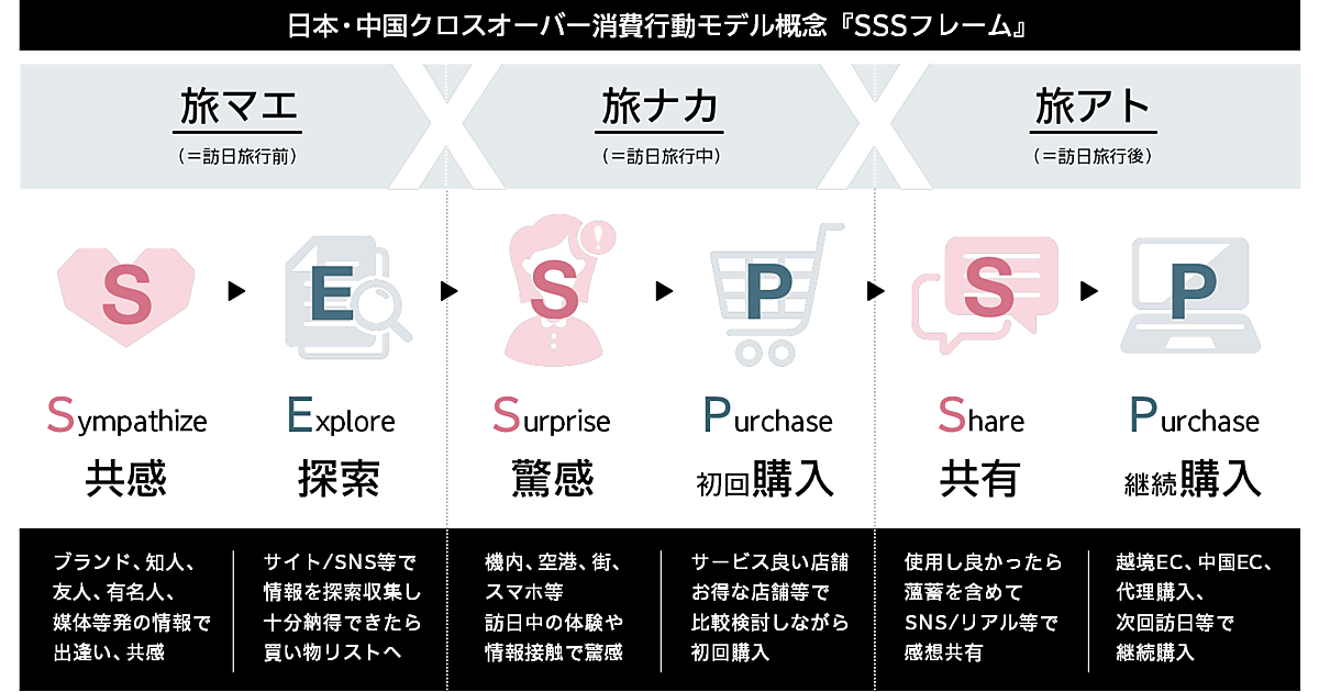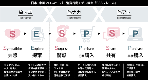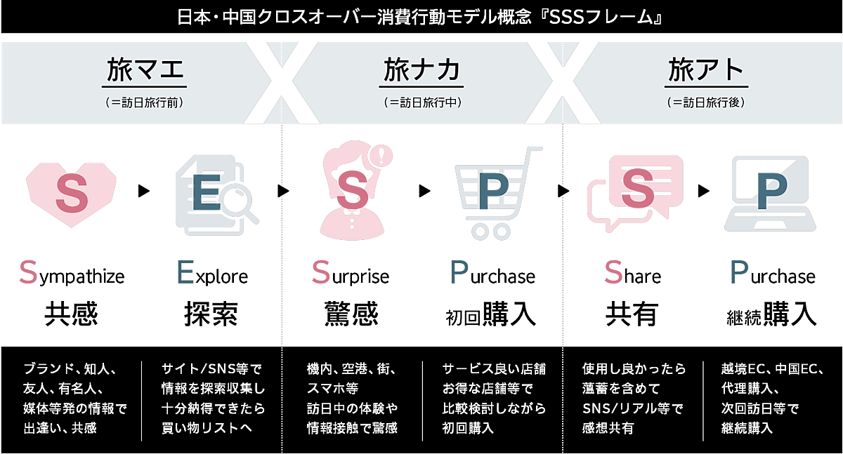 日本・中国クロスオーバー消費行動モデル概念「SSSフレーム」の開発と、中国の有力EC運営会社、Leqee(ラーチー)との戦略的業務提携が柱。SSSは「Sympathize(共感)」「Surprise(驚感)」「Share(共有)」。SSSフレームは、日本と中国を相互に影響し合う市場と考えてコミュニケーションプランニングに活用する概念。