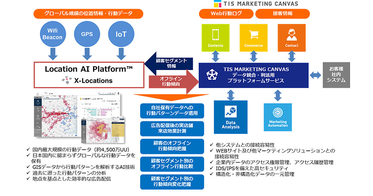 クロスロケーションズは国内最大級の位置情報データを持ち、AIで分析・解析して行動パターンデータとして蓄積。特定地点を基点に人の行動パターンが分析できる。TISはデジタルマーケティングを支援してきたが、クロスロケーションズとの提携で実社会での行動パターンデータを加え、より深い顧客分析を可能にする。