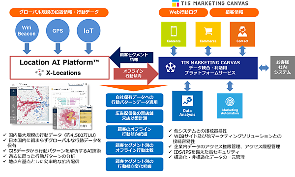 総合ITサービスのTISは、AI(人工知能)分析エンジンによる位置情報データ活用プラットフォームを提供するクロスロケーションズと資本・業務提携した、と12月2日発表した。クロスロケーションズ社の位置情報による行動データと、TISのデータ統合・利活用プラットフォームサービスを組み合わせた新サービスを展開する。