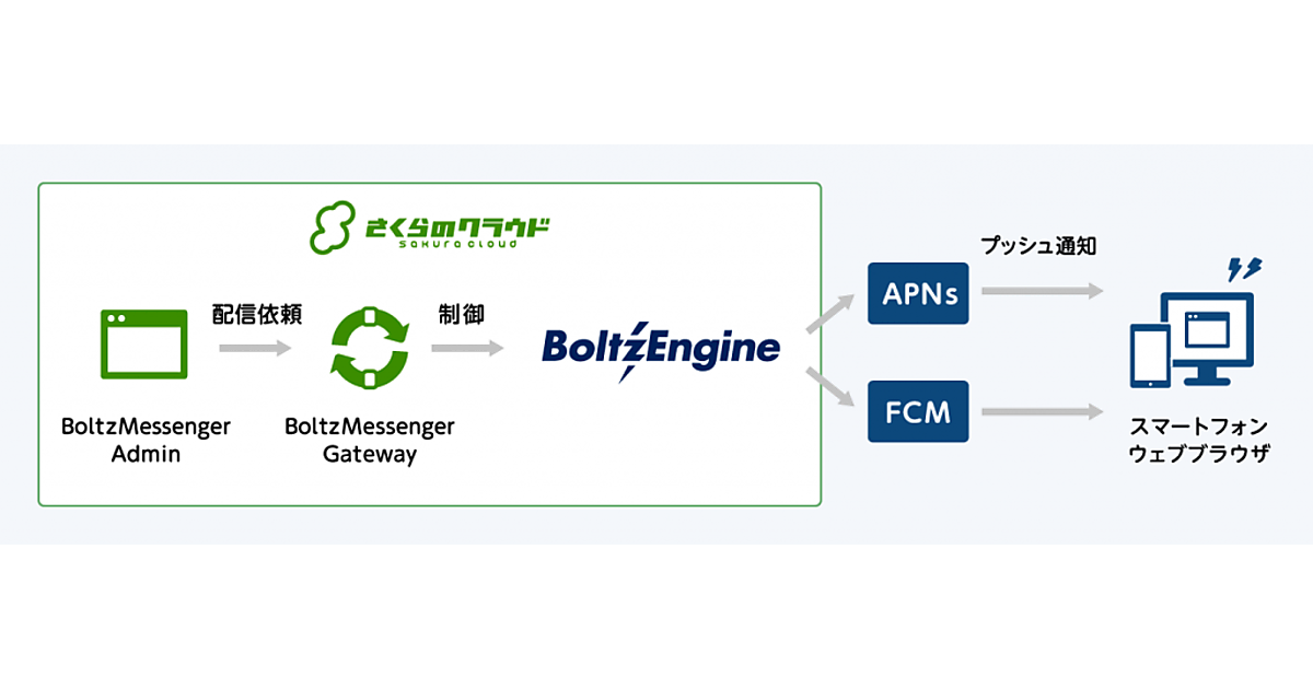 プッシュ通知は「iOS」「Android」で稼働するモバイルアプリと、パソコンのウェブブラウザに対応してメッセージを送信する仕組み。ユーザーにリアルタイム性の高いメッセージを配信し、新着・更新情報が通知できる。BoltzEngineは国内トップ水準の配信速度があるエンジンサービスで、1秒に3.5万機器に配信可能。
