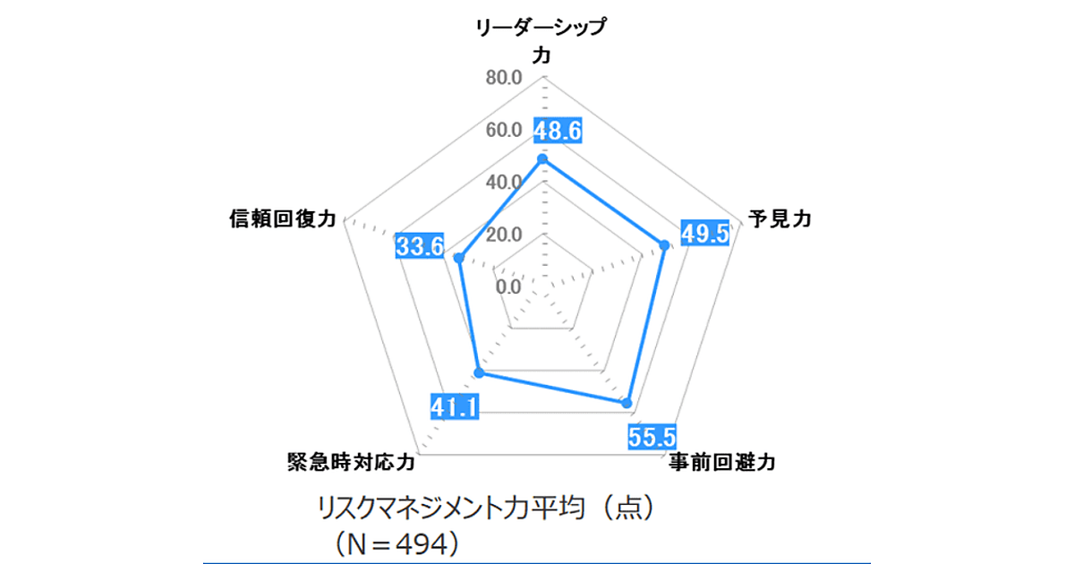 分野別では、全体平均スコアがもっとも高いのは「事前回避力」55.5点で、もっとも低いのは「信頼回復力」33.6点だった。