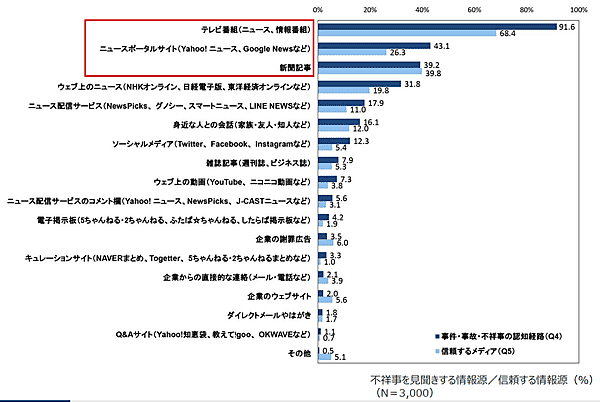 なお生活者が企業不祥事を見聞きする情報源としては「テレビ番組(ニュース、情報番組)」91.6%が圧倒的に多く、「ニュースポータルサイト(Yahoo!ニュース、Google Newsなど)」43.1%、「新聞記事」39.2%は、かなり低い。近年ネットからの企業告発も多いが、やはり“テレビで採り上げられること”がターニングポイントとして機能しているようだ。