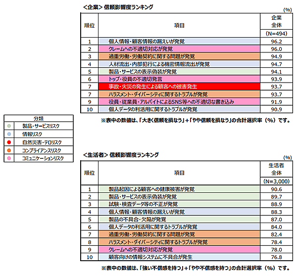 電通パブリックリレーションズの企業広報戦略研究所は、「企業のリスクマネジメントに関する調査」の結果を発表した。2015年に続き第2回目。企業向け調査(有効回答数494社)と生活者向け調査(有効回答数3,000人)を行っている。