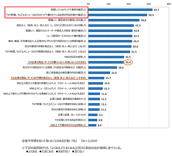 ただし、「企業の事件・事故・不祥事を知って取ったことがある行動」では、「信頼しているメディアで事実を確認した」63.7%、「TVや新聞、ウェブ上のニュースなどのメディアで書かれている批判の内容を細かく確認した」58.3%が上位となっており、情報を単一メディアで信用せず、生活者も複数ソースを確認する姿勢が強くなっていることが伺える。