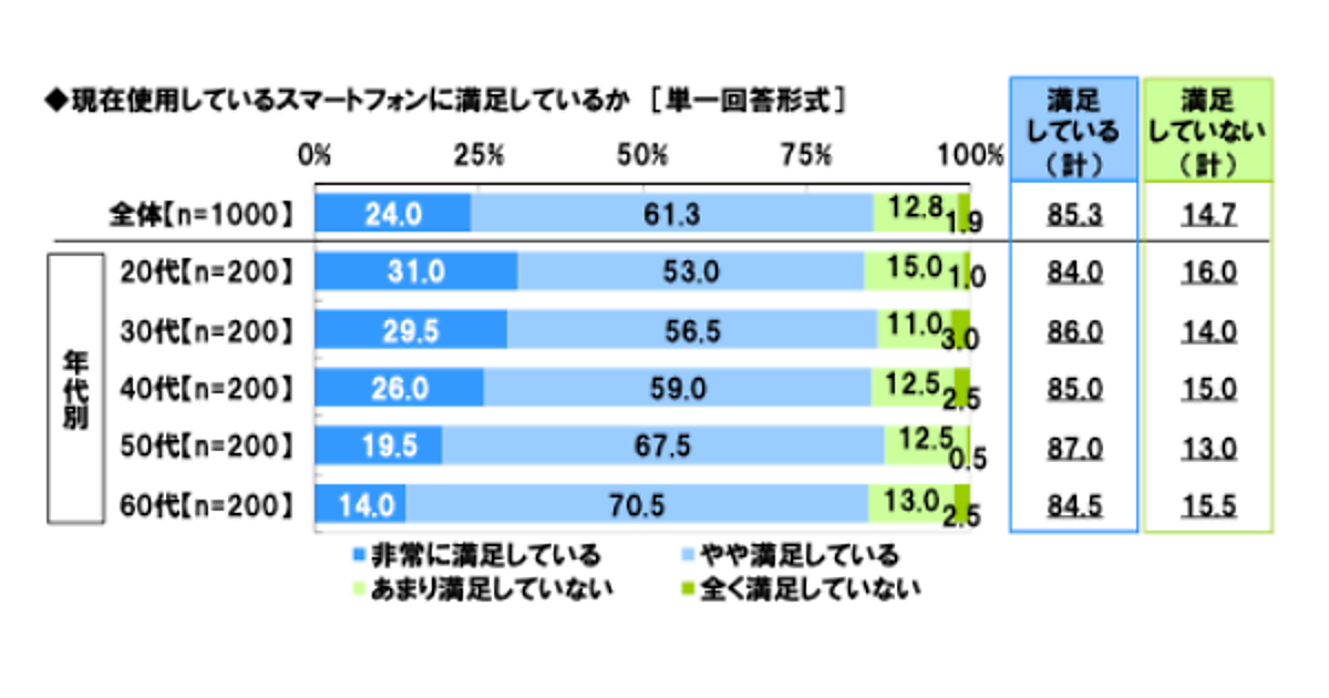 全回答者(1,000名)に、現在使用しているスマートフォンに対して満足しているかの質問に対して、全体の85.3%が「満足している(計)」と回答した。これを年代別にみると、最も高いのは50代(87.0%)、「非常に満足している」の割合をみると、20代(31.0%)が最も高い結果となった。