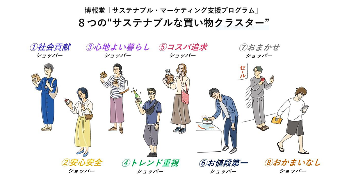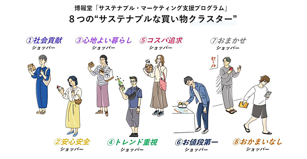 博報堂SDGsプロジェクトはマーケティング、ブランディング、ビジネス開発、PR、研究開発など、SDGsに関する経験や専門性を持つ社員で編成する。サステナブル・マーケティング支援プログラムでベースにするサステナブルな買い物クラスターは、生活者の食品・日用品でのサステナブルな購買行動を分析して8つに分類した。