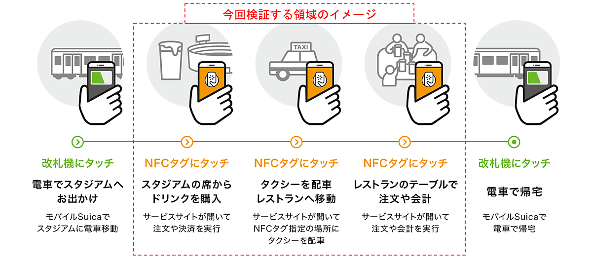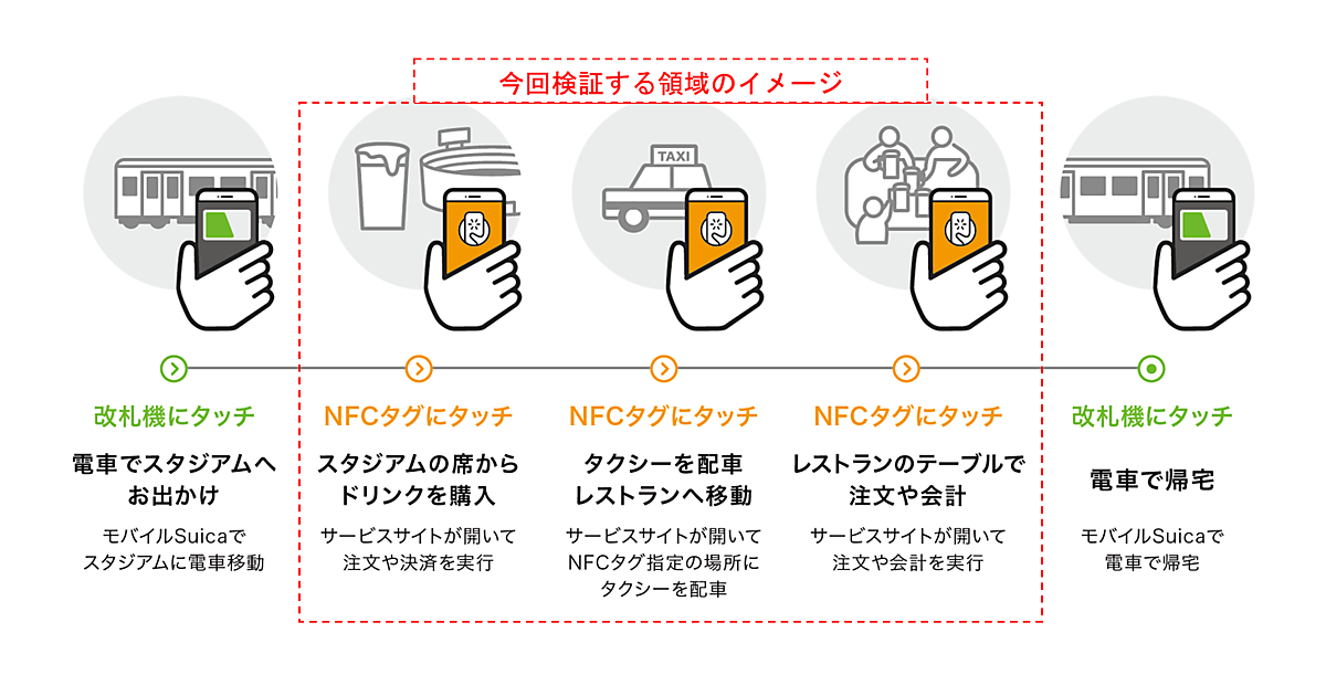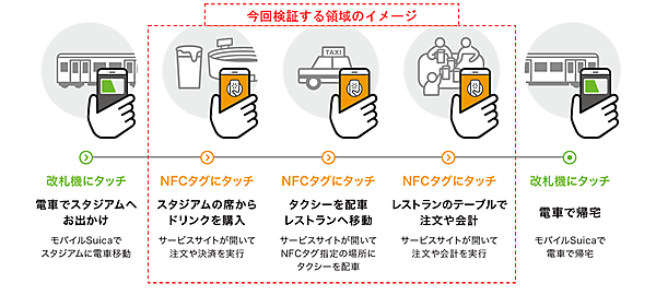 今回の技術検証は、NFCタグにスマートフォンをタッチするだけで、チケットの確認や支払いなどができる利用シーンを想定している。スマートフォンのNFC機能の一つである「リーダー/ライターモード」によって、NFCタグ内の情報を読み取る技術を活用している。