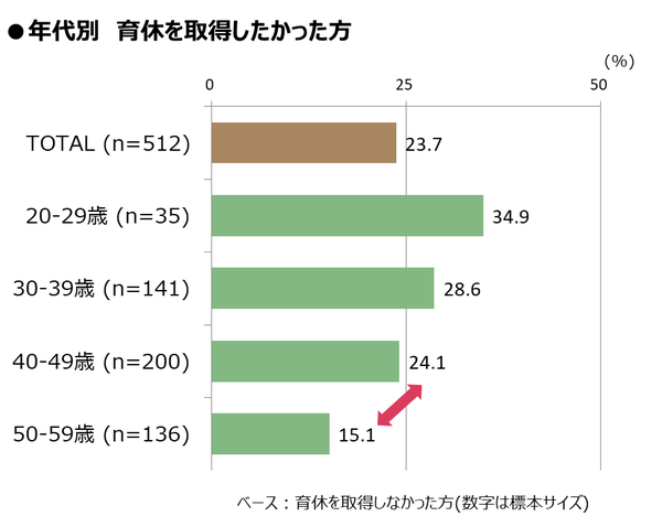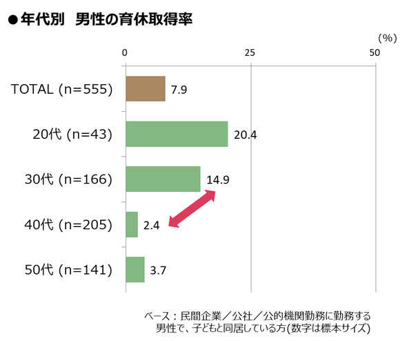 まず「育休の取得経験」について聞くと、育休を取得したことがあったのは、全体のわずか7.9%。年代別で見ると、20代は20.4%、30代は14.9%だが、40代・50代は2~3%台に大きく減少する。制度そのものが近年のもののため、どうしても高年齢層の取得率は下がるだろうが、それでも40代の2.4%はかなり低い。