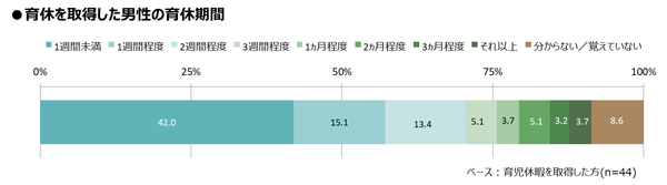 「取得した育休期間」を聞くと、「1週間未満」42.0%がもっとも多い。「1週間程度」15.1%を合わせて、とりあえず半数を超える。だいたい1週間が目安となっている模様だ。