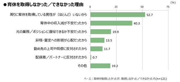 最後に「育休を取得しなかった/できなかった理由」を“育休を取得したかったがしなかった/できなかった”という121人に聞くと、「周りに(ほとんど)男性育休取得者がいないから」が52.7%で最多。「育休中の収入減が不安だったから」40.3%がそれに続く。「周りの理解」と「制度の充実」が今後の課題と言えるだろう。