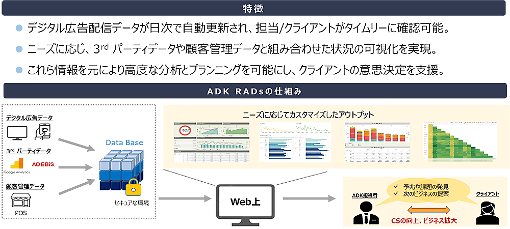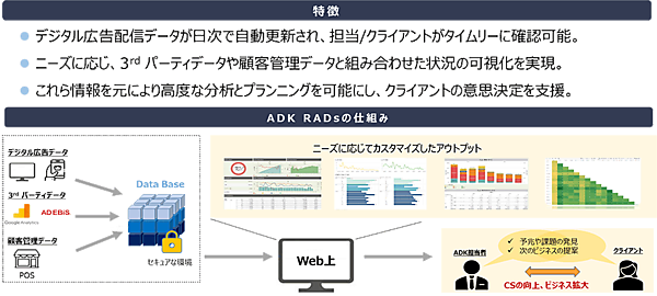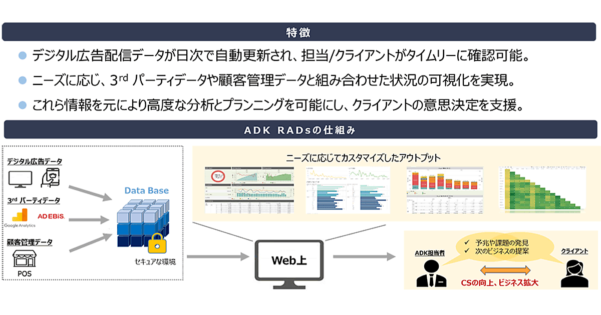 デジタルマーケティングのADKは、デジタル広告運用に関するデータを統合・可視化・分析することによってクライアントの意思決定を支援するダッシュボード「ADK RADs(Reporting & Analytics & Decision system)」のβ版サービス提供を開始する、と12月11日発表した。