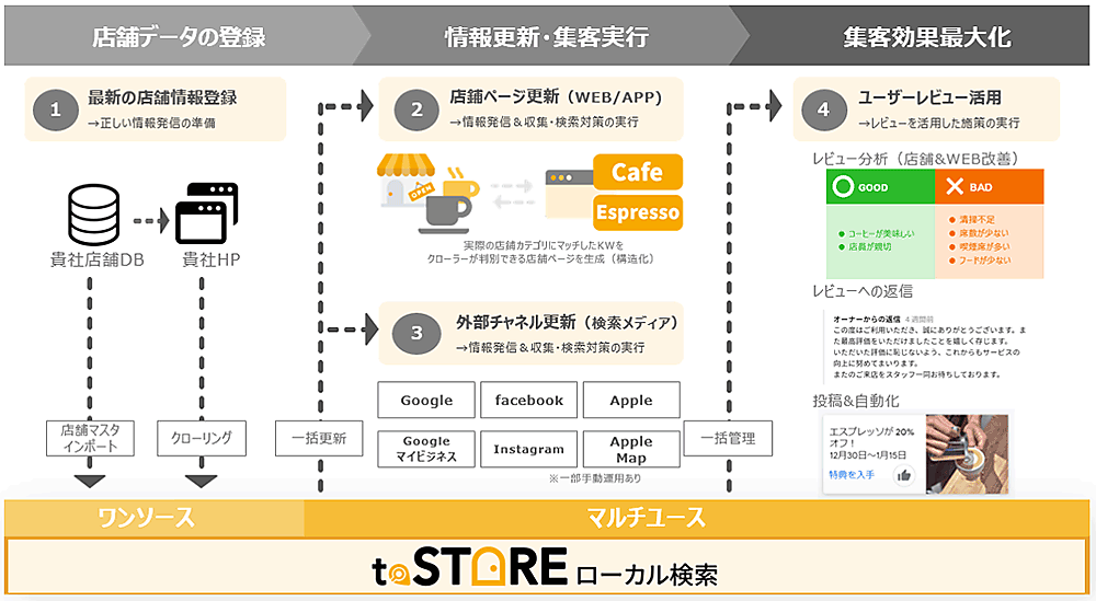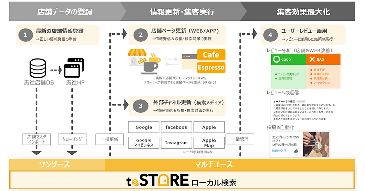 生活者が店舗に関する情報収集する場合、企業は正確で魅力的なコンテンツを届ける必要がある。toSTORE ローカル検索は、企業サイトや外部チャネルと連携させたい店舗情報を一括管理することができる機能となる。