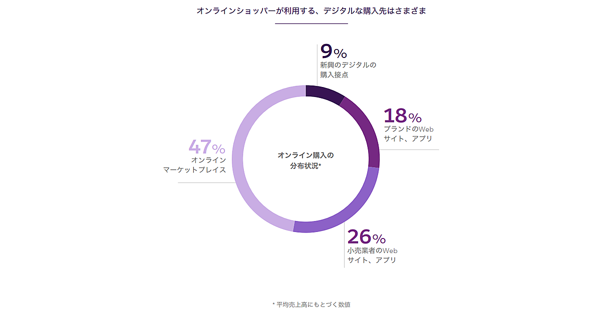 まず、消費者が頼る“デジタルな購入先”について調査すると、まずAmazon、eBay、Alibabaなどのオンラインマーケットプレイスが、オンラインショッピングの売上の47%を占めている。Walmart、Carrefour、Woolworthsなどの小売業者のWebサイトやアプリは、オンラインの売上のほぼ4分の1となる26%。Tory Burch、Columbia、資生堂など、ブランドのWebサイトやアプリは、直販などが健闘し18%に達している。一方、買い物客は8割以上が、これらのデジタル購入先を複数組み合わせて利用しているとみられる。