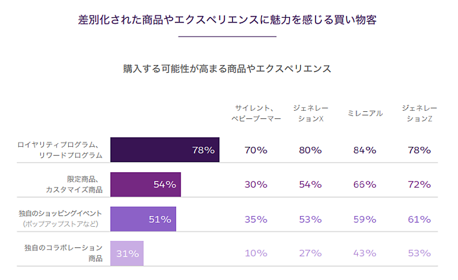 「どういった商品やエクスペリエンスに魅力を感じるか」を聞くと、「ロイヤリティプログラム、リワードプログラム」が全世代を通して高く「限定商品」「独自のコラボ商品」を大きく上回っている。また、「買い物客がもっとも好むブランドの特徴」では「個別のニーズに対応してくれる」が1位だった。「自分のことをよく理解し、特別に扱ってくれている」感が、関係性を高めると考えられる。