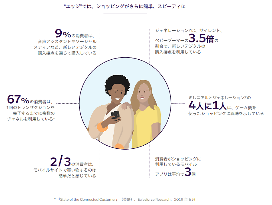 本調査では、ソーシャルメディア、メッセージングアプリ、音声アシスタントなど、店舗から遠く離れた場所(エッジ)に存在するチャンネルを利用して購入することを「エッジでの買い物」と呼称。今後の購入行動を決定づけるとしている。現在は10件の購入のうち1件がエッジで行われているというが、その比率は今後高まる一方だろう。