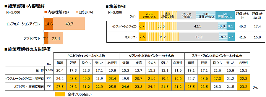 これらの現状に対し、JIAAでは「インフォメーションアイコン」「オプトアウト」といった施策を推進しているが、内容まで理解しているユーザーは1割前後に留まっている。ただし、これら施策の理解者のネット広告評価は比較的高いため、今後の浸透によって、ネット広告の印象が変化することが考えられると、JIAAは考察している。