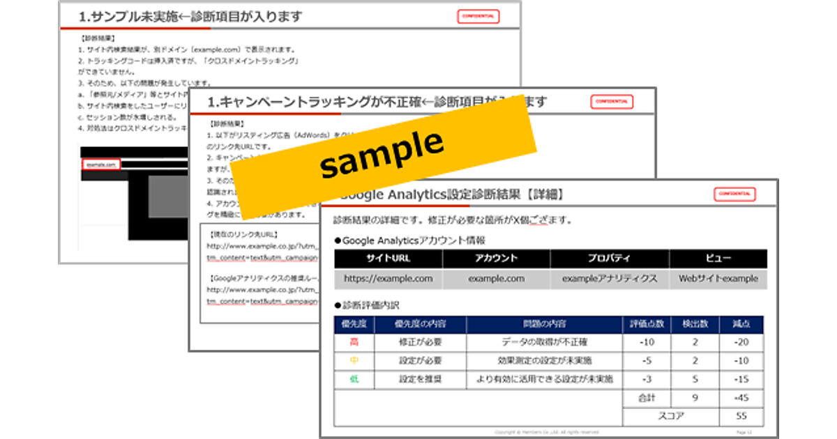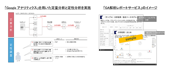 Googleアナリティクス導入済み企業が対象。GA設定診断はGoogleアナリティクスが正しく設定されているか診断し、どのような設定をするか提案。GA解析レポートはGoogleアナリティクスを使った定量分析とユーザーテストによる定性分析でサイトの現状把握と改善内容を示唆。SEO診断はSEOの観点でサイトの現状を分析する。