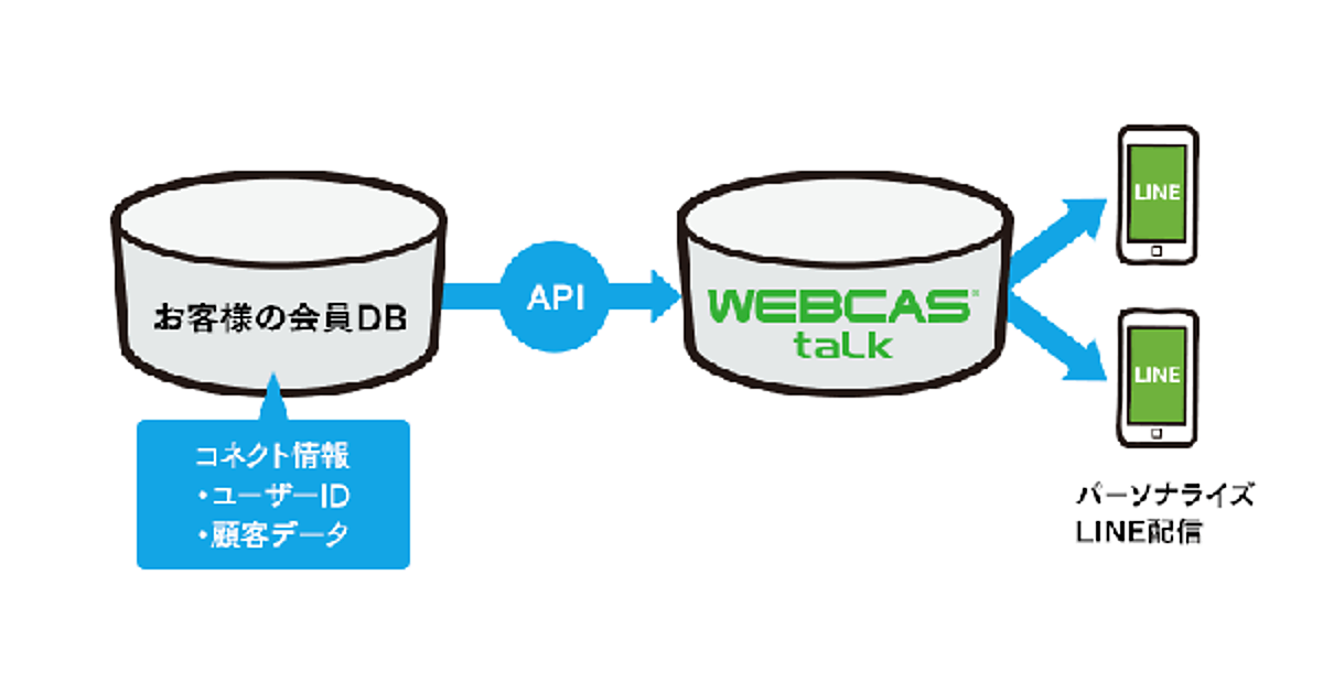 LINEのユーザーIDと、顧客の会員情報をひも付けたデータ(コネクト情報)をAPIで受け取る機能を追加した。WEBCAS taLkでパーソナライズ配信する場合、従来は会員情報とLINEユーザーのID連携をWEBCAS taLk側でだけ実行する仕組みだった。このため、コネクト情報を自社管理したい企業はカスタマイズする必要があった。
