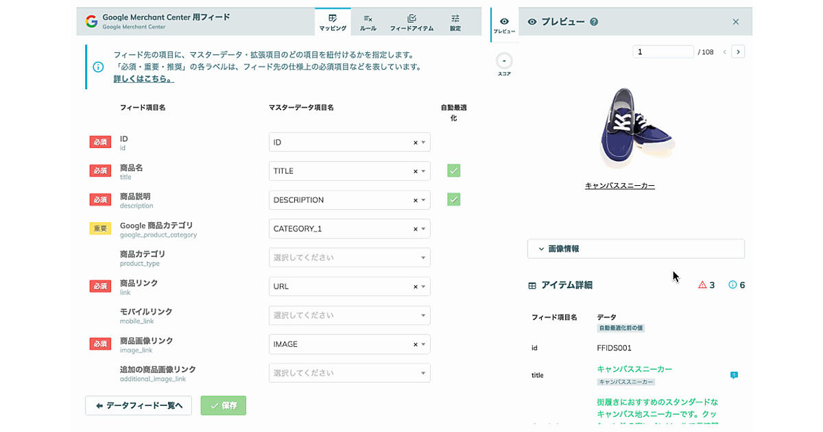 機能強化によって、ノウハウがなかったり経験が少なかったりしても、より簡単に質の高いデータフィード作成ができるようになり、データフィードの最適化を一層容易にした。評価スコアと改善アドバイ表示機能は現在、Googleショッピング広告のデータフィードを対象にするが、今後他の媒体にも順次対応していく。