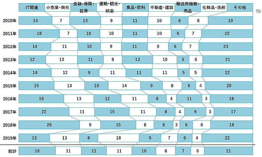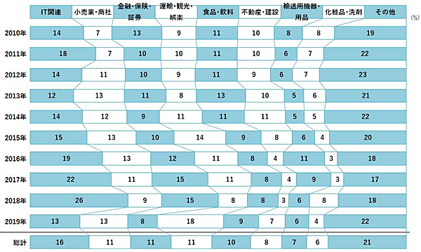 バナー広告で訴求している「商品種類別の推定インプレッションのSOV(Share of Voice)」では、10年間トータルで「IT関連」16%がトップシェア。以下「小売業・商社」「金融・保険・証券」「運輸・観光・娯楽」「食品・飲料」が続いた。2019年はとくに旅行代理業を中心に「運輸・観光・娯楽」のシェアが伸長している。