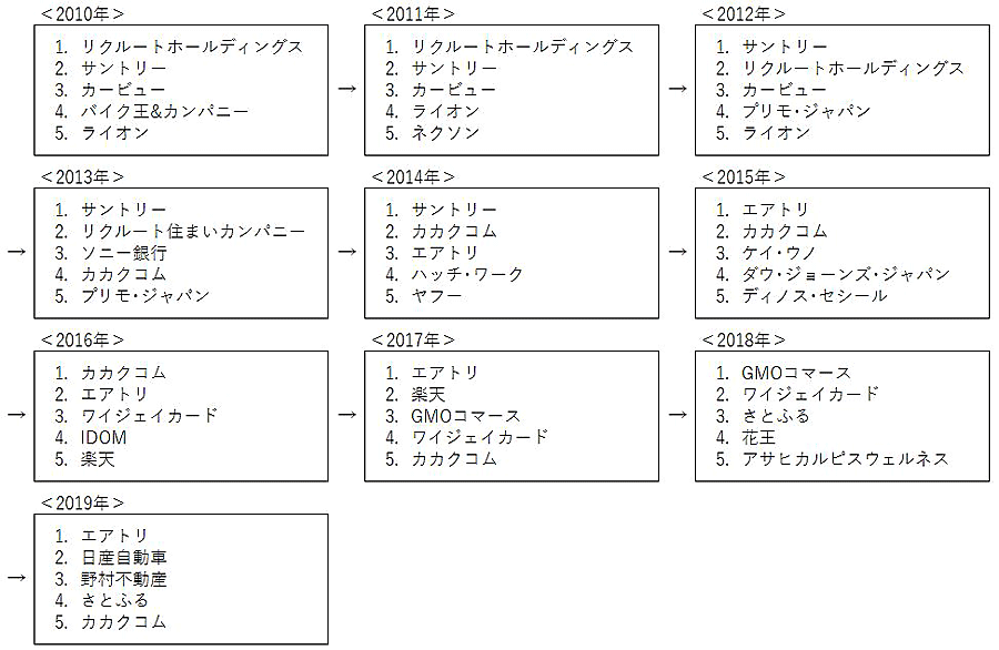 「年間でのPCバナー広告出稿量」の上位5社をみると、年間でトップに立ったのは「サントリー」「エアトリ」がともに3回、「リクルートホールディングス」が2回、「カカクコム」「GMOコマース」が各1回だった。2018年までは、上位5社のうち2社以上が翌年にもランクしていたが、2019年は「さとふる」以外、がらりと顔ぶれが変わっている。