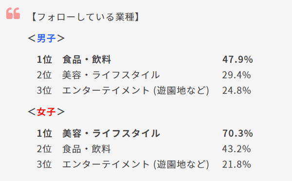 続いて、「企業アカウントをフォローしている」と回答した781名(男子高校生132名、女子高校生247名、男子大学生154名、女子大学生248名。全体の47.9%)に、「企業アカウントをフォローしている理由」を聞くと、男女とも1位は「フォローキャンペーンがあったから」と回答している。以下、2位3位も男女同順だが、男性は「有益な情報を発信するから」、女性は「その企業が好きだから」がやや高い。さらに「フォローしている業種」については、男性「食品・飲料」、女性「美容・ライフスタイル」がそれぞれトップと、やはり明確に差が出た。