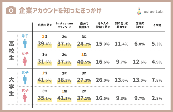 続いて、企業アカウントをフォローしている781名に、「その企業アカウントを知ったきっかけ」を聞くと、男子高校生・男子大学生は「広告を見た」が1位。一方、女子高校生は「自分で検索した」、女子大学生は「Instagramキャンペーン」が1位で、傾向がわかれる。“Instagramそのものの使い方・認識”が層ごとに異なるためと推測される。
