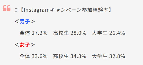 TesTeeが運営するリサーチメディア「TesTee Lab」は、「企業アカウントによるInstagramキャンペーン」に関する調査を実施した。Instagramを利用している高校生・大学生の男女1,631名(男子高校生296名、女子高校生502名、男子大学生333名、女子大学生500名)から回答を得ている。