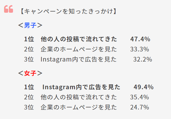 Instagramを利用している1,631名に「企業アカウントのInstagramキャンペーンに参加したことがあるか」を聞くと、男子の27.2%、女子の33.6%が参加経験あり。続いて「企業アカウントのInstagramキャンペーンに参加したことがある」と回答した507名(男子高校生83名、女子高校生172名、男子大学生88名、女子大学生164名。全体の31.1%)に、「キャンペーンを知ったきっかけ」を聞くと、「キャンペーンを知ったきっかけ」は、男子は「他の人の投稿で流れてきた」47.4%、女子は「Instagram内で広告を見た」49.4%がトップで、ここでも男女で差が見られる。