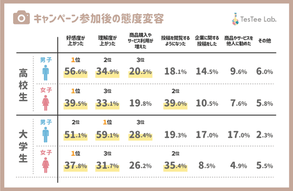 さらに、企業アカウントのInstagramキャンペーンに参加したことがある507名を対象に「キャンペーンに参加した後の行動・印象」について調査。男子大学生は「理解度が上がった」59.1%が最多で、男子高校生・女子高校生・女子大学生は「好感度が上がった」が最多だった。男性は能動的な行為(購入や投稿)が増加する一方、女性は受動的な行為(閲覧や感情面)が増加する、という印象だ。