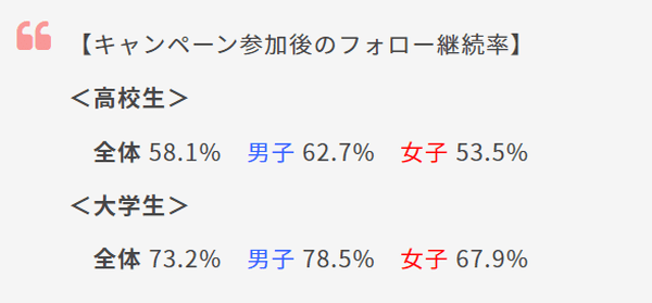 なおキャンペーン参加後のフォロー継続率を見ると、高校生よりも大学生のほうが高く、女子よりも男子のほうが高かった。